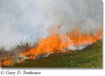 "From the house we could see our parents' silhouetted forms moving rapidly to and fro in hurried activity. They had lit backfires which were burning low and creeping in a lackadaisical way against the wind. Already a strip of grass land forty rods in length and thirty or forty feet in width was bared. The counter-fires moved in an unbroken line toward the fire-fostering gale… The prairie chickens were calling to each other in tones of distress like the wail of a banshee and skirring before the dazzling flames or flying bewilderedly into the seething holocaust. Some escaped but many were burned. A wandering wolf faintly tonguing a howl of defiance loped away.